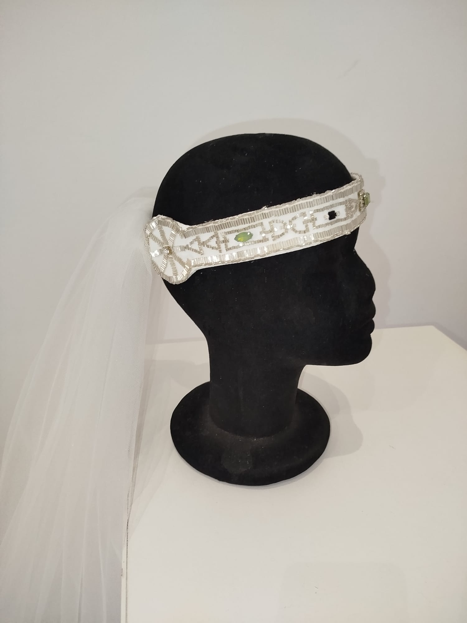 Tocado de rocalla de cristal Checo, Swarovski y metal sobre base de tejido. Opcional velo de 4 giras, velo de 2 giras o normal. Color blanco natural T:U.